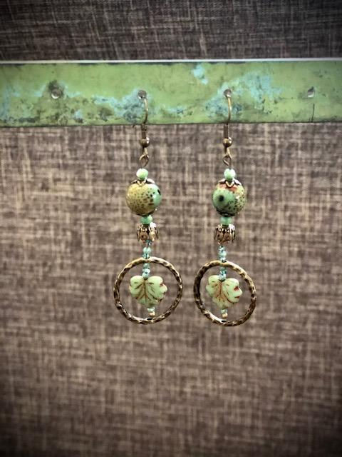 Rustic Boho Czech Glass Leafs and Ceramic Green bead Earrings